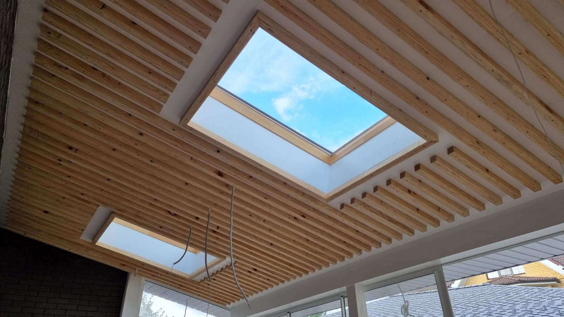 Фасадное остекление и WERSO. Устройство потолка с декоративными брусками из ЛВЛ бруса.